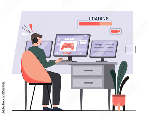 Video game developer. Man in headphones sits at computer and develops games. Programmer and IT specialist writes code. Development of video games and arcades. Flat vector illustration