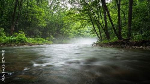 Video generation of a misty river flowing through a dense forest. Featuring calm and mystery