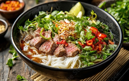 Vietnamese Pho with Beef and Rice Noodles in a deep bowl