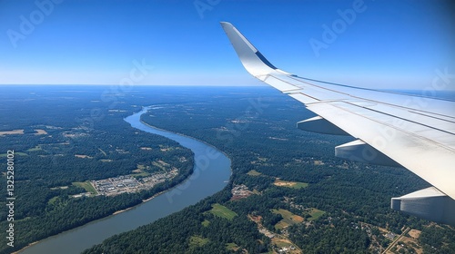 View from an airplane window flying over Indiana, with rolling farmland, dense forests, and the Ohio River visible below. The landscape is peaceful and dotted with small towns.