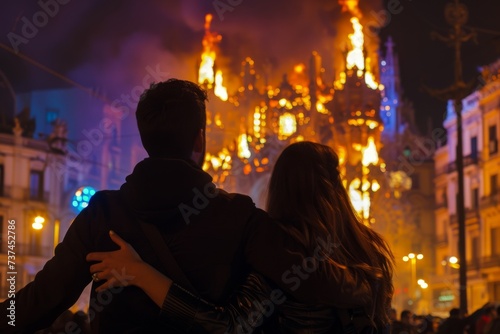 view from behind, a couple view the monument burning up of "las fallas" festivity in Valencia