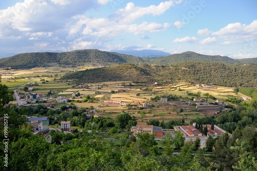 View from Cardona Castle. Sunlit large valley with colorful fields and small houses. The valley is surrounded by green mountains. Blue sky and white clouds. Summer. Catalonia, Spain.