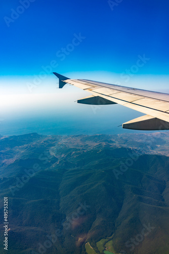 View from the airplane window at a beautiful blue clear sky and the airplane wing
