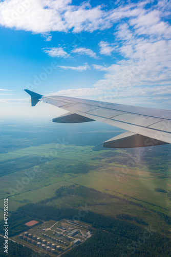View from the airplane window at a beautiful blue sunrise and the airplane wing in clear sky.