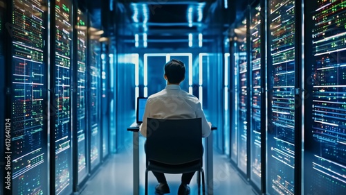 View from the back of a man using a laptop in a big data center office. High Speed Server Transfer, Science Technology Breakthrough, Development, and Innovation Concept. GENERATE AI