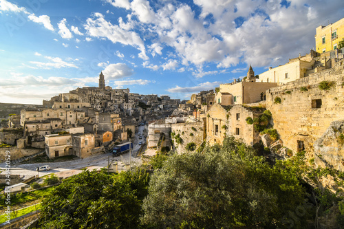 View from the convent of Saint Agostino a traffic drives down the main road through the ancient city of Matera, Italy.