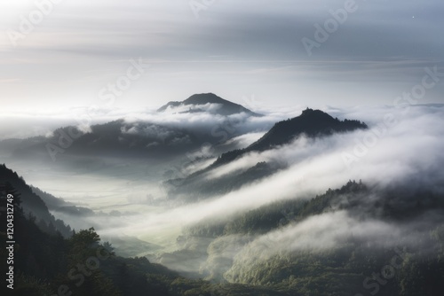 View of a mountain range covered with fog. The fog creates a hazy atmosphere, revealing the mountain peaks and the green landscape below. The sky is covered with clouds.