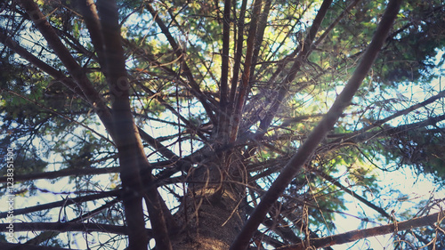 View of a pine tree trunk from below. Intertwining branches against the background of a sun glare and sky. Vintage style