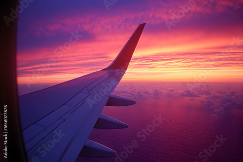 View of a plane wing on a dramatic sunset sky. Aerial scenic landscape with vibrant colors. Travel vacation concept.