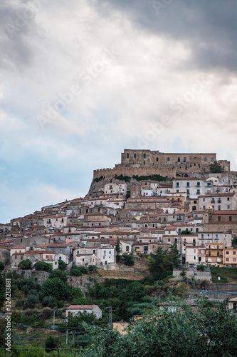 View of ancient village of Rocca Imperiale, in Calabria, during a sunset of August