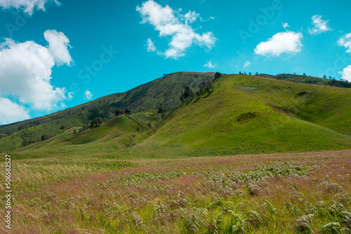 View of beautiful savanna and hill at Bromo Mountain Area with blue cloudy sky background