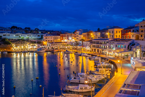View of cafes, restaurants and boats in harbour at dusk, Cales Fonts, Es Castell, Menorca, Balearic Islands, Spain