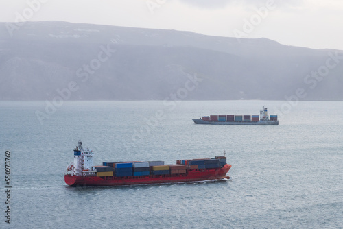 View of cargo ships sailing in the sea bay. Autumn seascape. Sea freight, logistics and supply in the Russian Far East. Container ships in Nagaev Bay, Sea of Okhotsk. Magadan, Magadan Region, Russia.