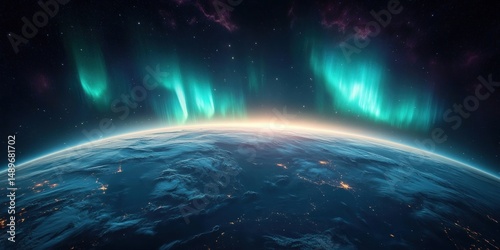 View of Earth from space with atmospheric glow and vibrant green aurora borealis lighting up the night sky over the planet's horizon