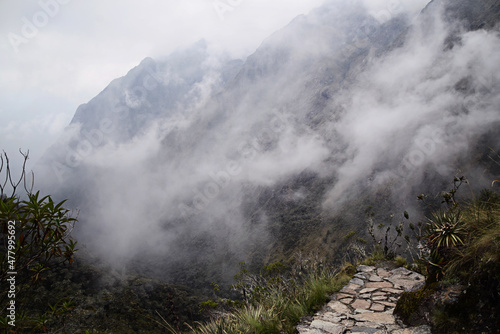 View of landscape this misty morning in the mountains. Low clouds on the Andes mountain and with no people on famous Inca trail in Peru, South America.