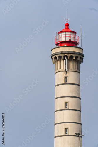 View of lighthouse, typical Portuguese architecture, with nice details and very particular framing, blue sky as background, located in Leça da Palmeira, Porto, Portugal. Matosinhos. Leça Beach