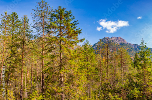 View of magical nature in Dolomites at the national park Three Peaks (Tre Cime, Drei Zinnen) during sunset and golden Autumn, South Tyrol, Italy.
