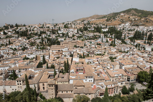 View of the city from the top of Alhambra Palace at Granadda, Spain. The bird's eye view of the city with lush greeneries look amazing. The day seems to be sunny.