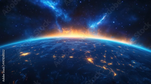 View of the Earth from space during sunrise with visible city lights and a vibrant starry galaxy in the background