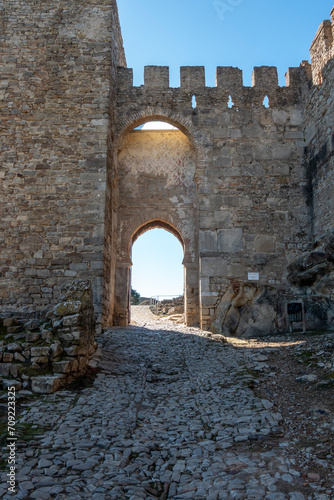 View of the entrance gate to the castle of Jimena de la Frontera, a beautiful village in the province of Cadiz, Andalusia, Spain.