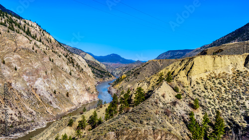 View of the Fraser River along Highway 99, from the area called the 10 mile slide or Fountain Slide, as the river flows to the town of Lillooet in the Chilcotin region on British Columbia, Canada