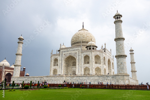 View of the imposing Taj Mahal in Agra, India, with its wonderful architecture and gardens on a cloudy day