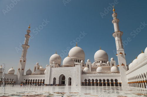 View of the main entrance of the Sheikh Zayed Grand Mosque in Abu Dhabi. The largest mosque in the United Arab Emirates.