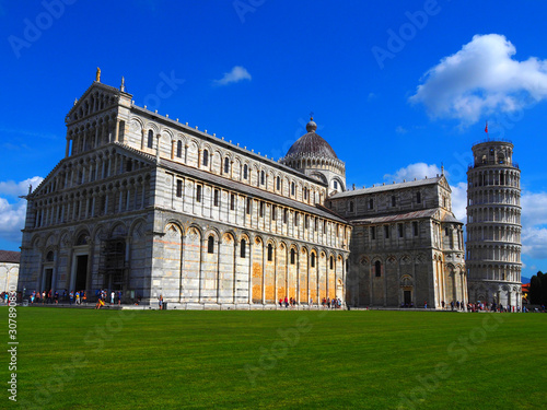 View of the Pisa Cathedral (Duomo di Pisa) and the Leaning Tower of Pisa (Torre pendente di Pisa) in Pisa, Italy. They are located in Miracoli Square (Piazza dei Miracoli).