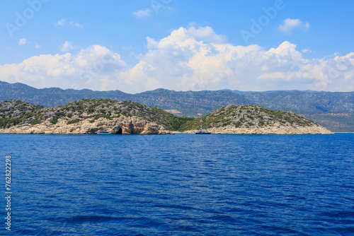 View of the rocky shore from the sea. Mediterranean Sea in Turkey. Popular tourist places. Background