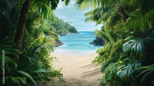 View of the sandy beach and blue ocean through the green leaves of palm trees and tropical plants