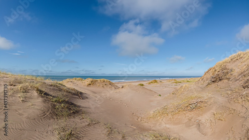 view of the sea from some dunes with some vegetation and footprints. Blue sky with clouds.