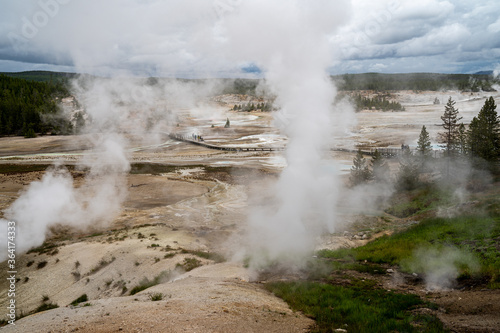 View of the steaming geysers and thermal features in Norris Geyser Basin boardwalks