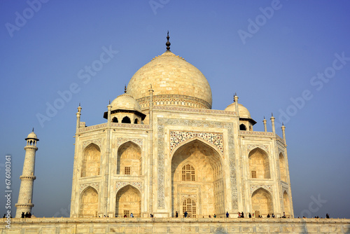 View of the Taj Mahal at sunrise is an ivory-white marble mausoleum on the right bank of the river Yamuna in Agra