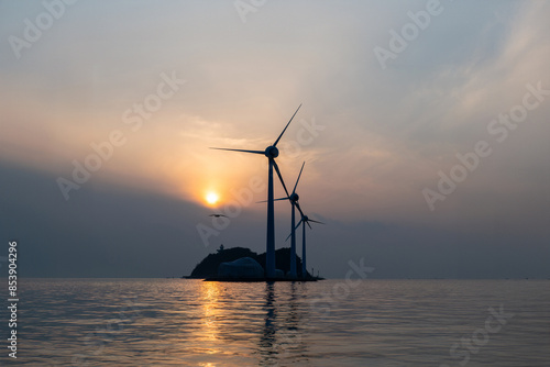 View of the wind turbines and flying seagulls during sunset on the sea