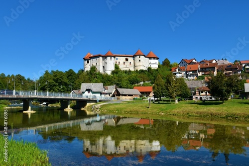 View of Žužemberk castle in Suha Krajina, Dolenjska, Slovenia from across river Krka and a reflection of the castle in the water