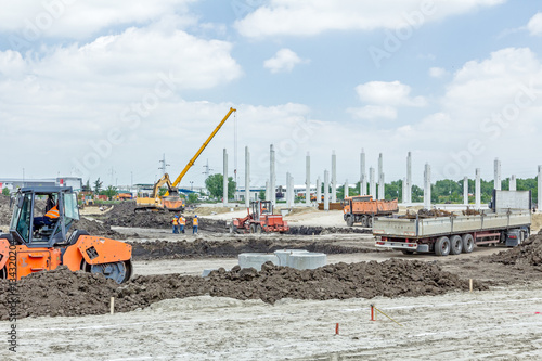 View on construction site with machinery, unfinished modern edif
