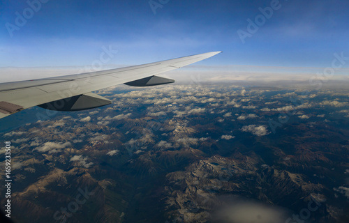 View through an airplane window catching the amazing mountains through the clouds, with the plane's wing prominently displayed against the horizon.