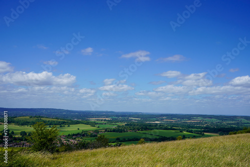 Views over countryside farm fields with clouds in blue sky in the summer