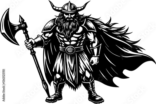 Viking warrior with a horned helmet, flowing beard, battle axe, and a billowing cape, standing in a powerful pose sketch Linocut Vector