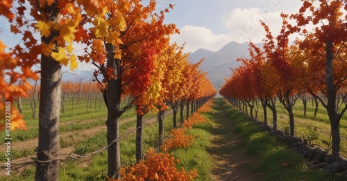 Vines in the vineyard ablaze with vibrant autumn colors, red, yellow, earthy tones