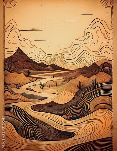 Vintage abstract map art depicting rugged Wild West terrain with detailed contour lines and natural features. Generative AI