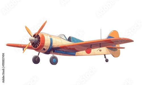 Vintage aircraft with propeller, colorful design, Japanese markings, parked on runway, retro style, detailed illustration, isolated on transparent background, png