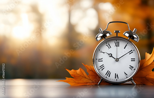 Vintage alarm clock on autumn leaves with a classic retro design