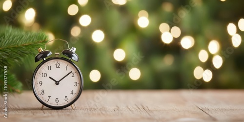 Vintage alarm clock on wooden table with blurred festive lights in background.