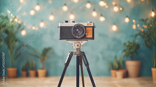 Vintage Camera on Tripod, Teal Background, Home Studio