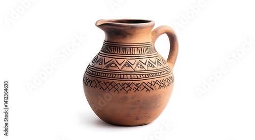 Vintage clay jug with decorative patterns isolated on white background