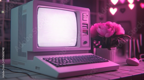Vintage computer with pink-lit screen, set in a cozy, romantic atmosphere.