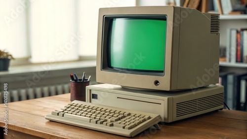 Vintage desktop computer with green screen
