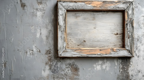 Vintage distressed wooden frame with peeling paint and weathered details on a textured grungy concrete wall Empty space for copy or text overlay