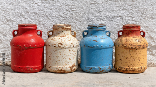 Vintage farm, Old milk cans beside a weathered wall in high fidelity image.